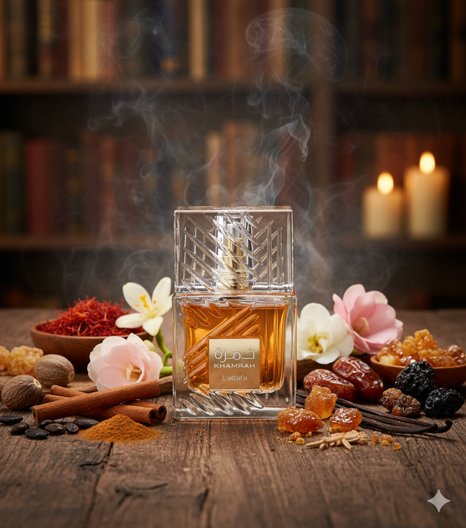 Khamra är en fyllig och sensuell doft som förenar kryddig värme med gourmand-sötma. Den öppnar med glödande kanel, muskot och frisk bergamott, som leder in i ett rikt hjärta av dadlar, praliné och vit blomsterprakt. I basen vilar en beroendeframkallande harmoni av vanilj, tonkaböna och amberwood, fördjupad av mystisk myrra och benzoin.